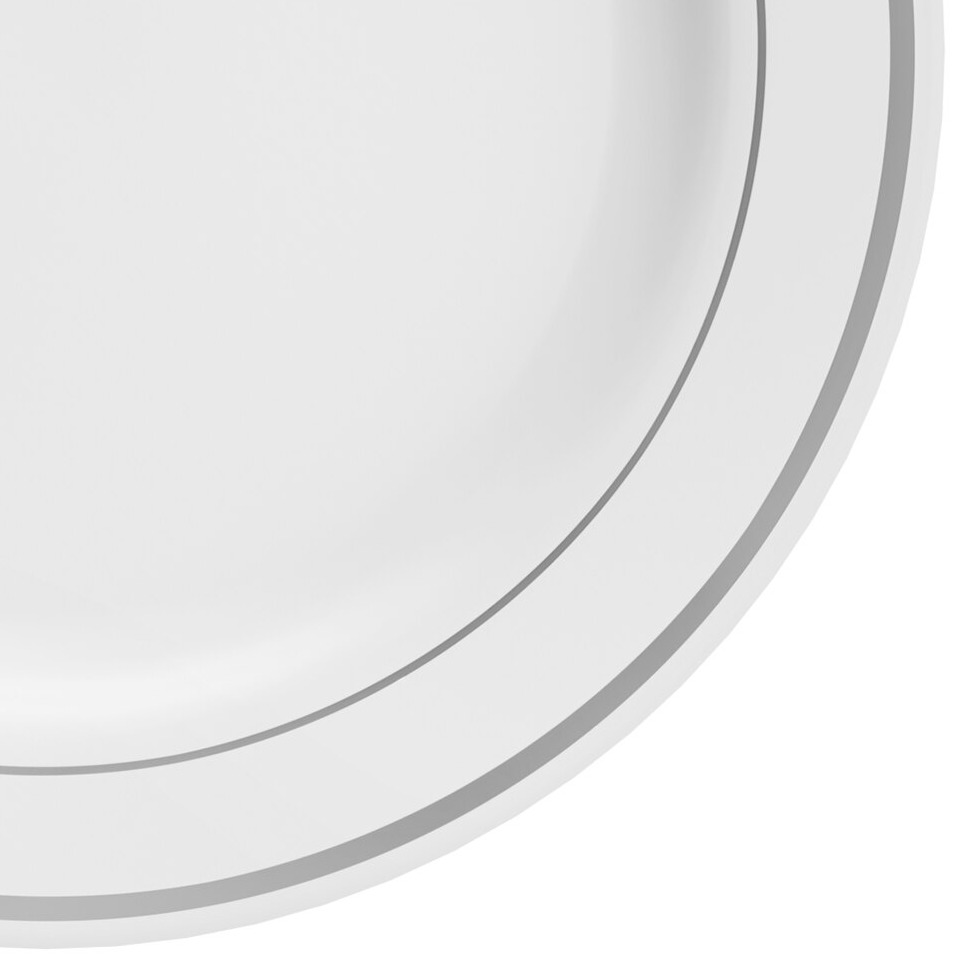 Featuring a contemporary silver band pattern along the wide outer rim, this plate's striking contrast between rim and stark white body is sure to draw attention while adding an upscale look to your wedding receptions, banquets, or other catered events.