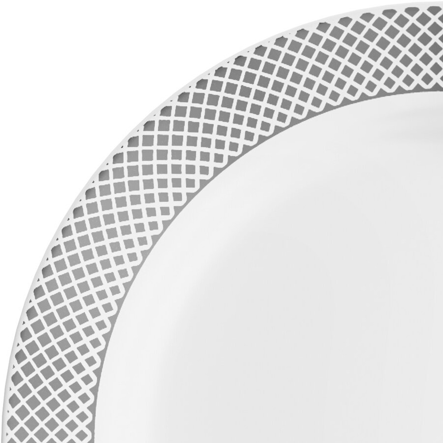 Providing the look of china at a fraction of the cost, this Visions Lattice 9" white plate with silver lattice design gives you the appearance you want with the convenience you need! It's disposable to eliminate time wasted washing dishes, and has none of the related storage and transport costs of real china. Plus, the attractive appearance makes it ideal for elegant dining environments where real china simply isn't feasible or desired!