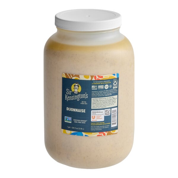 Infuse flavor into your signature dishes with this Sir Kensington's dijonnaise! Tangy mayonnaise and pungent Dijon mustard combine in this crowd-pleasing condiment for a burst of sharp flavor that will make even the most discerning palates take notice. It's made from a tasty blend of certified-humane, cage-free eggs, ground brown mustard, vinegar, cane sugar, and lemon juice. With flavor derived from a focus on high-quality ingredients, it contains no artificial ingredients, colors, preservatives, or high-fructose corn syrup, so you can feel good about serving this dijonnaise to your customers.
