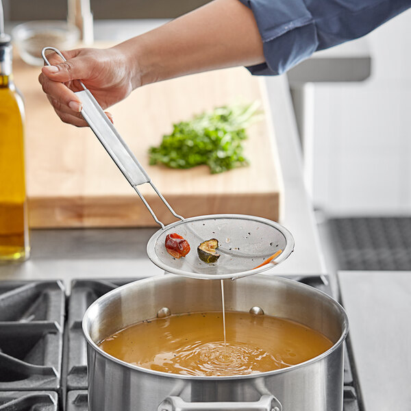 Whether you're using it to skim fat off soups, remove food remnants from braises, or strain sauces and gravy, this extra fine mesh skimmer is a versatile tool that will quickly become a staple for your detail-oriented kitchen tasks. Upgrade from traditional slotted spoons and experience the efficiency and precision of the Choice 5 1/2" round extra fine mesh skimmer.