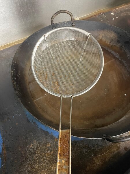 This "spider web" is an essential for any kitchen. We use it mainly to scoop green beans from stock pots or kettles into hotel pans.