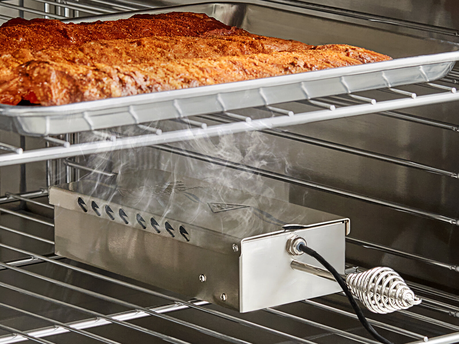 This portable smoker box works with a variety of ovens to add flavor and color to your foods. It requires a 120V electrical connection for operation.