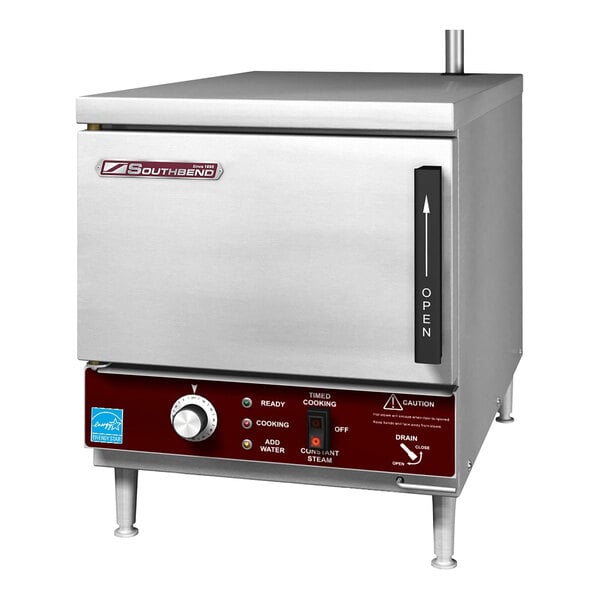 Ensure the productivity and efficiency of your kitchen with this Southbend EZ18-3 3-pan electric countertop convection steamer! Designed for effortless, high-efficiency pressureless steam cooking vegetables, fruits, meats, seafood, and poultry, this steamer features a compact countertop design with a manual water-fill mechanism and a manual drain valve, which means no drain or plumbing connection is required (drain pan sold separately). That makes it ideal for fast-paced commercial kitchens of all sizes! This unit holds (6) 1" deep full-size food pans, (3) 2 1/2" deep full-size food pans, (2) 4" deep full-size food pans, or (1) 6" deep full-size food pan (sold separately). This item is made with a 316 stainless steel clean water reservoir chamber with coved corners, and it includes (1) 16 oz. QuickClean scale control treatment.