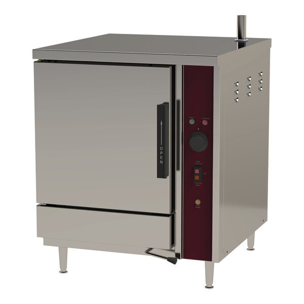 This boilerless steamer is made with a durable satin-finish 304 stainless steel exterior cabinet and a 1-piece, welded 316 stainless steel cooking chamber with coved corners for easy cleaning. This steamer features a welded heavy-gauge stainless steel door with a stainless steel outer liner, a removable steel inner liner, a full-perimeter gasket seal, and a positive lock-and-seal mechanism with a spring release. The door's interlock switch interrupts steam generation when the door is open, and it reactivates when the door is closed. This steamer features a removable steam diffuser plate that ensures even steam distribution for consistent results and prevents objects from falling into the reservoir. It also features removable stainless steel pan supports for easy cleaning. For added stability, it features 4"-5 1/4" adjustable, leveling legs.