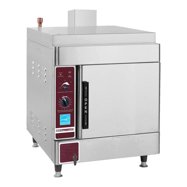 This boilerless steamer is made with a durable satin-finish 304 stainless steel cabinet and a 356 cast aluminum cooking chamber, with a food-grade, scratch-resistant, non-stick, hard anodized finish. A circulating convection fan inside the chamber increases steam velocity and provides efficient steam distribution to speed the cooking process. It features an insulated stainless steel door with a magnetic door switch and a full-perimeter gasket seal. The door's switch interrupts steam generation when the door is open, and it reactivates when the door is closed. The switch also triggers a variety of safety features, including a low / high water limit, a heat switch, a temperature probe, a water sensing probe, and a water-fill timer.