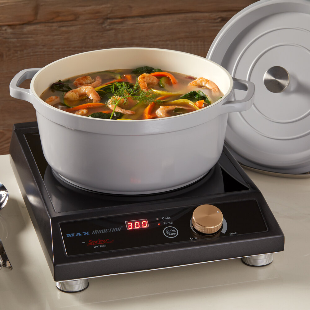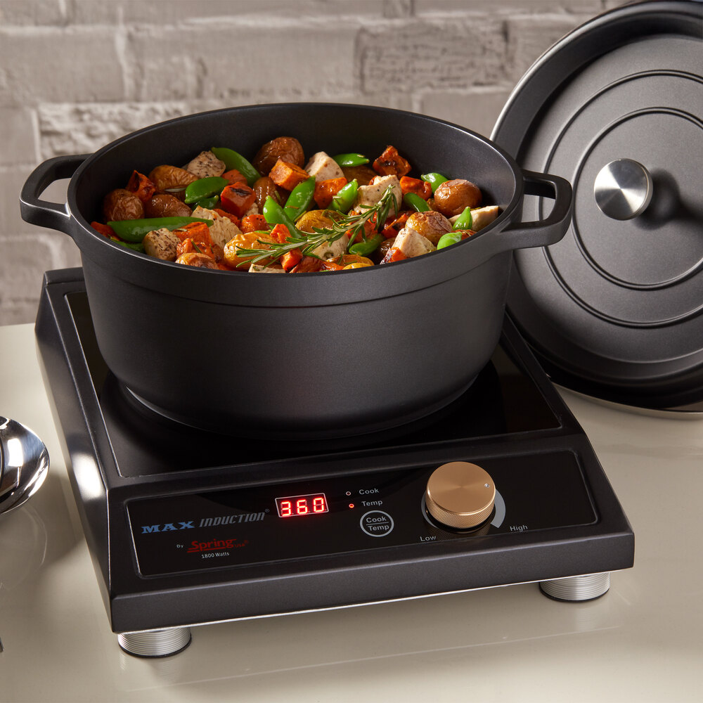 This reliable Spring USA SM-181C-T MAX Induction cook and hold induction range was designed with innovation and optimal performance in mind. This energy-efficient unit can quickly and precisely reach a maximum temperature of 400 degrees Fahrenheit (204 degrees Celsius) in just 90 seconds, ensuring optimal precision and execution. This range is compatible with a wide range of induction-ready cookware. For added safety and ease of use, this model also features sturdy non-skid, non-scratch footing and a 7' power cord.