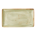 Elevate your tabletop presentation with this Steelite Performance Craft 13" x 7 1/2" green rectangular tray. Featuring a rustic design inspired by generations of handcrafted pottery, this tray combines traditional charm with contemporary appeal. Its earthy green hue with a bold brown rim and unique speckled pattern give each piece a one-of-a-kind look, making it a distinctive choice for any table setting.