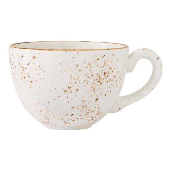 Elevate your beverage service with this Steelite Performance Craft 16 oz. white low cup. Featuring a rustic design inspired by generations of handcrafted pottery, this cup combines traditional charm with contemporary appeal. Its bold brown rim and unique speckled pattern give each piece a one-of-a-kind look, making it a distinctive choice for any table setting.