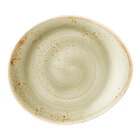 Elevate your tabletop presentation with this Steelite Performance Craft 6" x 5 1/4" green FreeStyle plate. Featuring a rustic design inspired by generations of handcrafted pottery, this oblong plate combines traditional charm with contemporary appeal. Its earthy green hue with a bold brown rim and unique speckled pattern give each piece a one-of-a-kind look, making it a distinctive choice for any table setting.