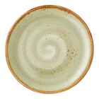 Elevate your tabletop presentation with this Steelite Performance Craft 8" green coupe plate. Featuring a rustic design inspired by generations of handcrafted pottery, this plate combines traditional charm with contemporary appeal. Its earthy green hue with a bold brown rim and unique speckled pattern give each piece a one-of-a-kind look, making it a distinctive choice for any table setting.