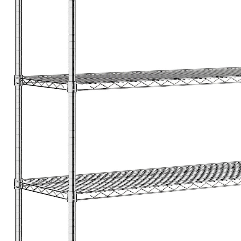 This shelf kit features a chrome wire construction that’s designed to be used in dry environments. Chrome provides excellent durability and is easy to clean and keep sanitary. Set this unit up in your stock room, food pantry, warehouse, garage, or retail area to keep your products organized.