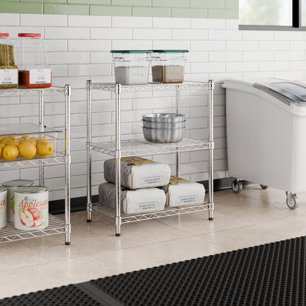 Keep your storage area organized with this commercial-grade Steelton shelf kit! This shelf kit includes (3) 14" x 24" wire shelves, (4) 30" posts, and (12) pairs of split sleeves to create a convenient storage solution for your janitorial closet, warehouse, restaurant, or bar's storage areas. Incredibly easy to install, this kit can be quickly assembled for immediate use! Its chrome wire construction is designed to be used in dry environments. Chrome provides excellent durability and is easy to clean and keep sanitary. With adjustable shelves, this unit gives you the flexibility to store items of varying heights, such as ingredient bins, boxes, and cleaning supplies.