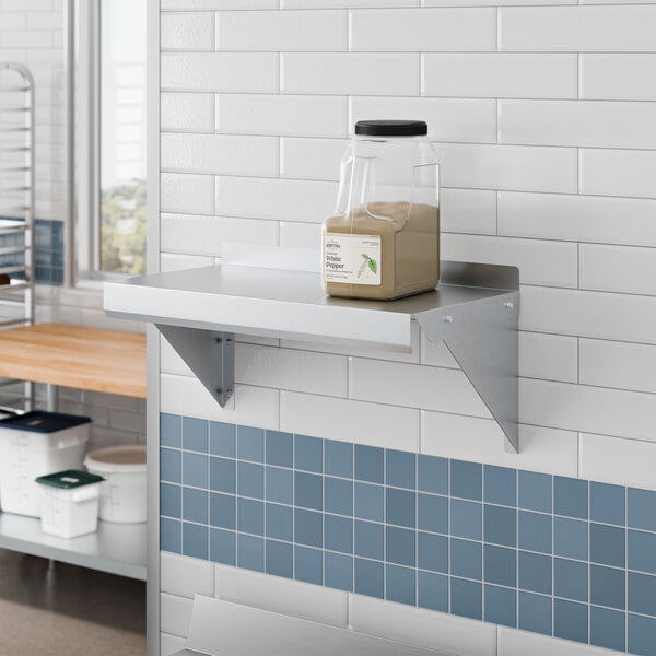 Enhance your storage space with this Steelton Metal Products wall-mount shelf. This shelf is made of 20-gauge galvanized steel for superior durability and easy cleaning. Plus, it offers a sleek look that complements any environment. It is ideal for use in low-volume kitchens and restaurant startups.
