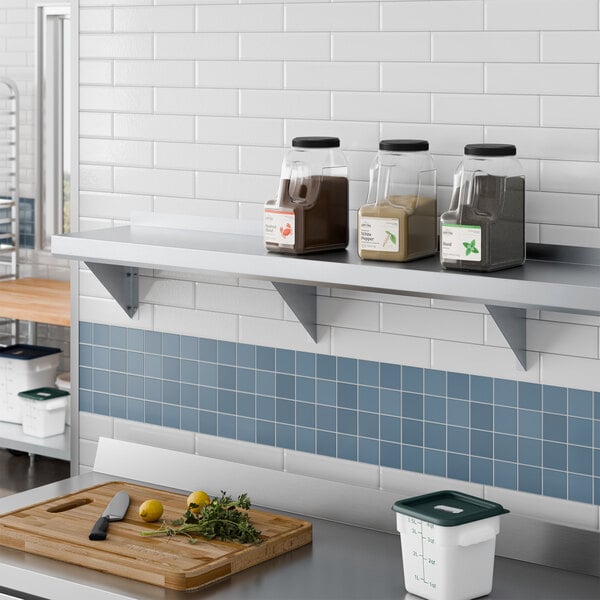 This shelf features a slim, space-saving profile. It includes 4 support brackets for easy wall mounting (hardware sold separately), allowing you to maximize your storage capacity without using valuable counter space. Keep ingredients, dishes, and kitchen tools from cluttering your work area with this reliable shelf.