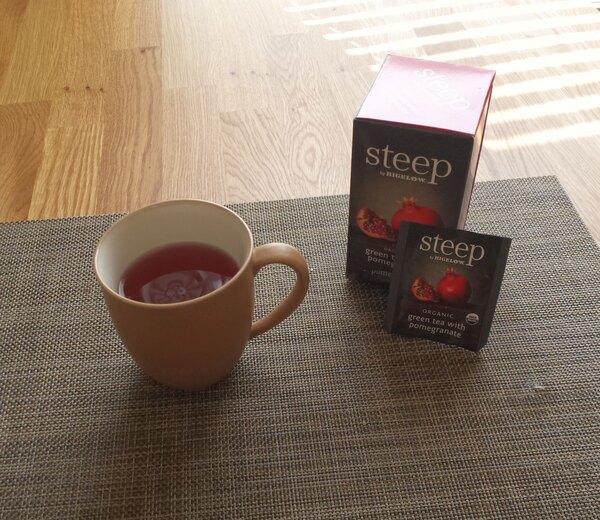I'm very happy with this product by Steep. The price is wonderful for organic tea. Green tea with pomegranate flavor to sweeten it up. Would definitely purchase again.