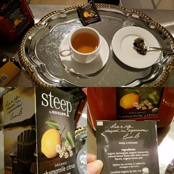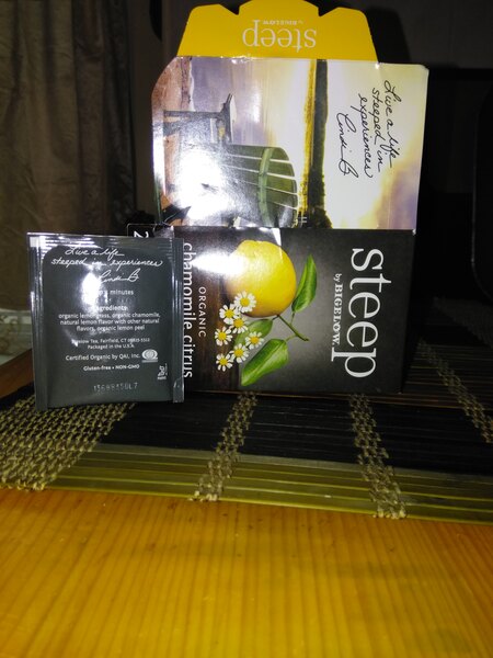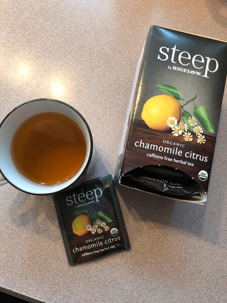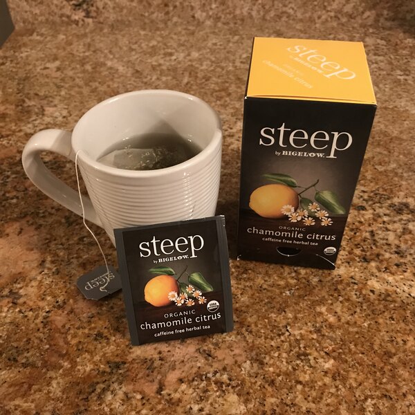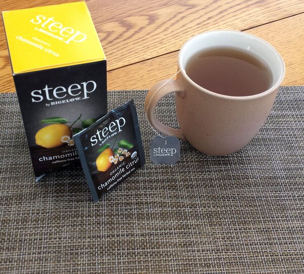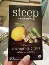 Steep by Bigelow organic chamomile citrus caffeine free herbal tea is a natural organic chamomile blended with perfect hint of lemon is sweet and soothing way to unwind anytime of the day take steep take a deep breath and relax