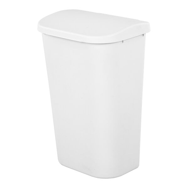 Maximize efficiency and keep your space clean with the Sterilite 11.3 gallon white rectangular wastebasket with lid. This sleek wastebasket features a stylish design and easy-to-clean, textured finish, making it a practical and attractive addition to any office, hotel, or restaurant. The lift-top lid opens easily with one hand, providing convenient access while ensuring secure closure to keep odors contained and maintain a tidy environment. Its hidden hinges allow the trash liner to be placed without fully removing the lid. Its durable construction is BPA- and phthalate-free, ensuring a safe and environmentally friendly waste disposal solution.