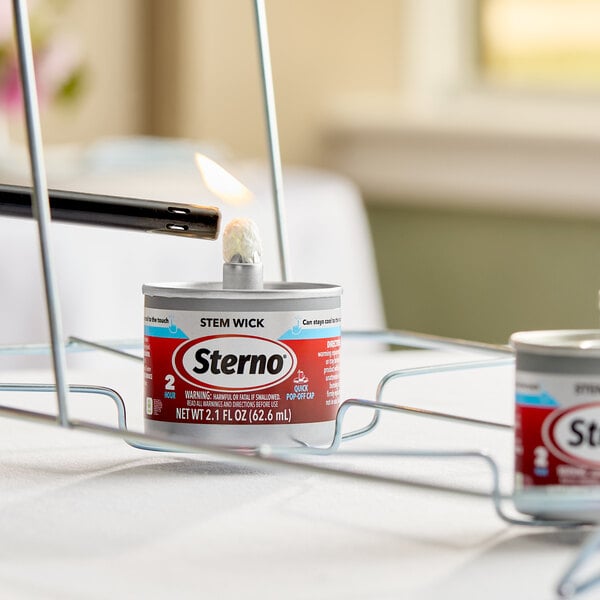 Perfectly portioned for shorter engagements, this Sterno 10100 stem wick chafer fuel burns for up to 2 hours without replacement, making it ideal for use in room service and hot beverage service applications alike! This chafing fuel is safer than most, with a can that stays cool when lit and a nonflammable design for peace of mind if spilled.