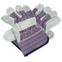 Protect your hands with this striped canvas pair of gloves with shoulder split cowhide leather palm coating and 2 1/2" rubber wrists. The Gunn cut pattern boasts a more comfortable fit with the heavy leather material, and the fine seams are sewn away from the heavily used areas of the glove to provide a long-lasting construction. The 2 1/2" rubberized safety cuffs are an added safety measure to ensure that every part of your hand and wrist remains protected during use. Perfect for warehouses, construction sites, and handy-man jobs alike, this pair of gloves is sure to boost both safety and productivity.