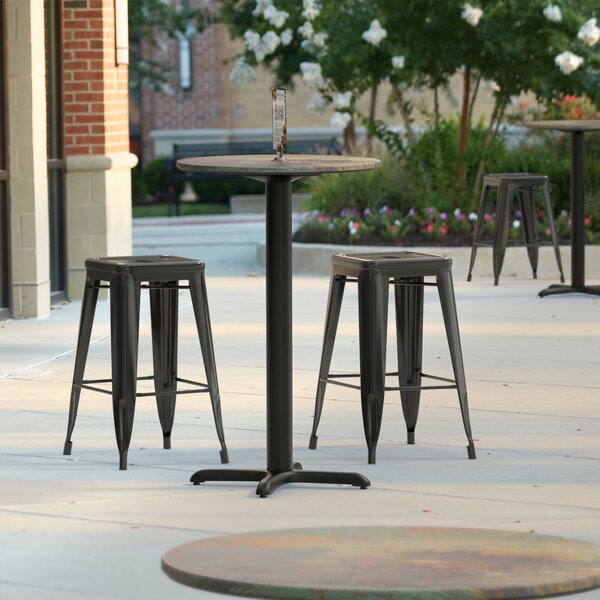 The included cross column table base elevates the table to counter height and ensures that the table stays steady and balanced while guests enjoy your signature drinks and dishes. Made of strong stamped steel with a sleek and resilient black e-coating, it's well equipped to weather the elements and resist corrosion. Blending into any environment to enhance your dining space, this table base and column are sure to provide reliable long-lasting use at both indoor and outdoor eateries. Plus, pre-drilled holes allow for the use of floor glides to protect your flooring from scuffs and scratches!