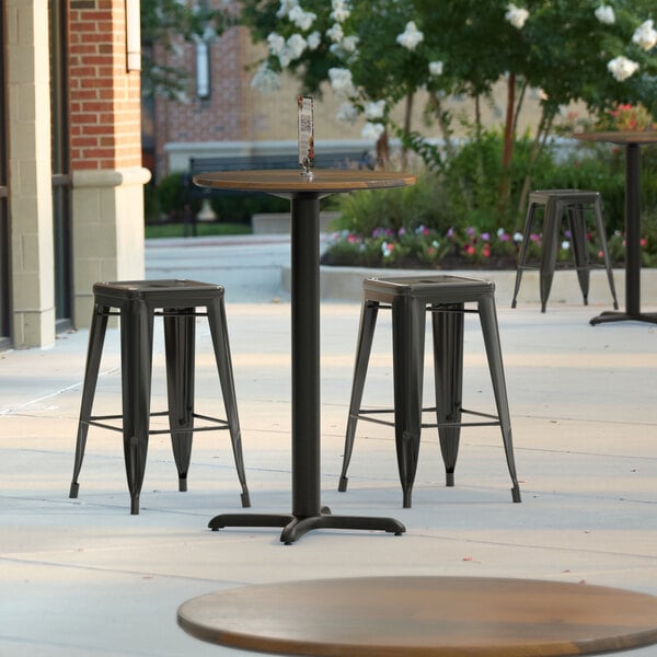 The included cross column table base elevates the table to counter height and ensures that the table stays steady and balanced while guests enjoy your signature drinks and dishes. Made of strong stamped steel with a sleek and resilient black e-coating, it's well equipped to weather the elements and resist corrosion. Blending into any environment to enhance your dining space, this table base and column are sure to provide reliable long-lasting use at both indoor and outdoor eateries. Plus, pre-drilled holes allow for the use of floor glides to protect your flooring from scuffs and scratches!