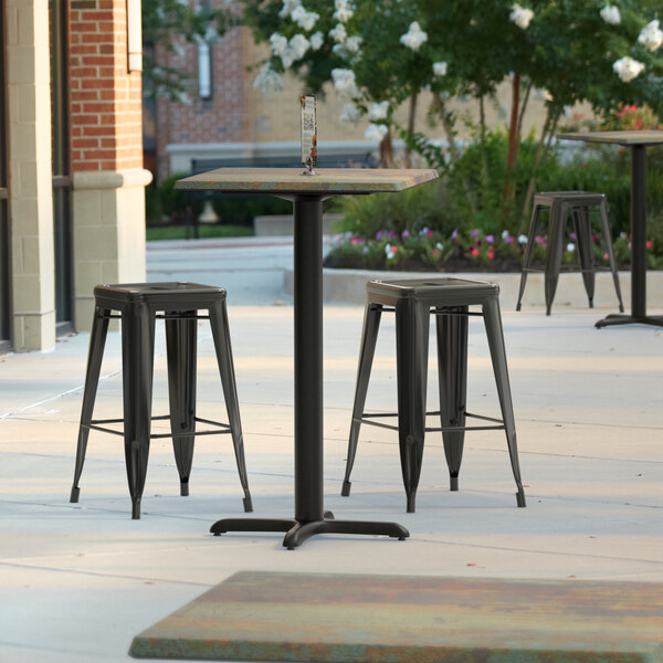 The included cross column table base elevates the table to counter height and ensures that the table stays steady and balanced while guests enjoy your signature drinks and dishes. Made of strong stamped steel with a sleek and resilient black e-coating, it's well equipped to weather the elements and resist corrosion. Blending into any environment to enhance your dining space, this table base and column are sure to provide reliable long-lasting use at both indoor and outdoor eateries. Plus, pre-drilled holes allow for the use of floor glides to protect your flooring from scuffs and scratches!