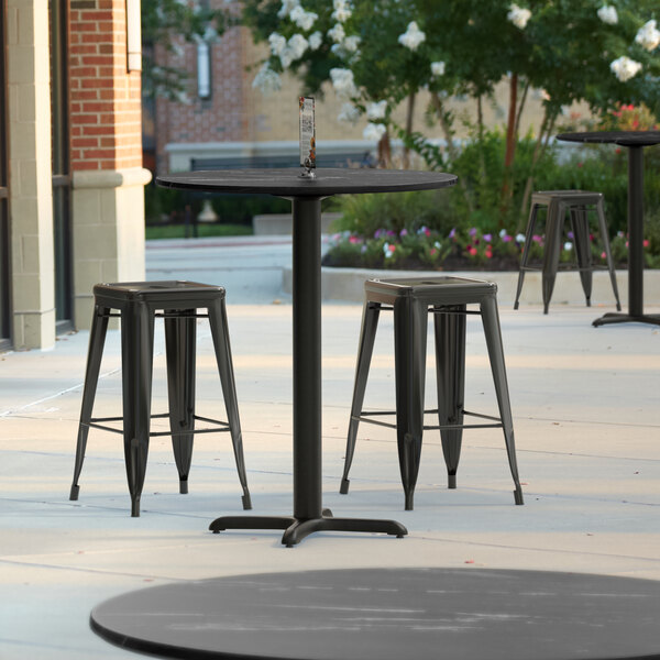 The included cross column table base elevates the table to counter height and ensures that the table stays steady and balanced while guests enjoy your signature drinks and dishes. Made of strong stamped steel with a sleek and resilient black e-coating, it's well equipped to weather the elements and resist corrosion. Blending into any environment to enhance your dining space, this table base and column are sure to provide reliable long-lasting use at both indoor and outdoor eateries. Plus, pre-drilled holes allow for the use of floor glides to protect your flooring from scuffs and scratches!