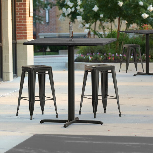 The included cross column table base elevates the table to counter height and ensures that the table stays steady and balanced while guests enjoy your signature drinks and dishes. Made of strong stamped steel with a sleek and resilient black e-coating, it's well equipped to weather the elements and resist corrosion. Blending into any environment to enhance your dining space, this table base and column are sure to provide reliable long-lasting use at both indoor and outdoor eateries. Plus, pre-drilled holes allow for the use of floor glides to protect your flooring from scuffs and scratches!