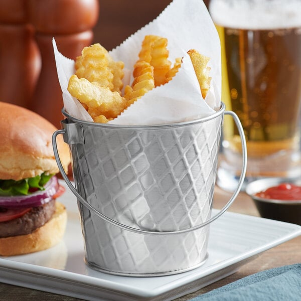 This Tablecraft 10041 Lattice 16.5 oz. round stainless steel serving pail is the perfect way to add a casual yet sleek touch to your dining tables! While its shining, silver color promotes an eye-catching display, its imprinted basket weave pattern lends a unique appearance that'll enhance the look of your sharable appetizers and sides. Use it to serve your specially-seasoned fries, piled-high tortilla chips, or peel-and-eat shrimp.