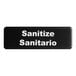 Clearly label your dish washing area with this TableCraft 394595 9" x 3" sanitize / sanitario sign! Remind both your English and Spanish-speaking employees to stay in designated areas when sanitizing your pots, pans, and dishes. Made of durable plastic, this sleek sign has great color contrast. The white-on-black lettering allows everyone to see and read this sign from across a kitchen.