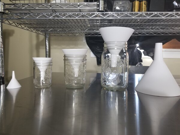 These are good all-purpose funnels. The different sizes make them useful for all tasks, and there's always a clean funnel on hand. The smallest one is especially useful for filling spice containers.