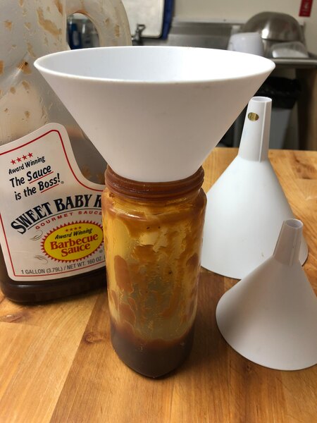 Great set of funnels. Pretty much a necessity to get thicker BBQ sauces into FIFO bottles. All of them are quite durable and can handle dishwasher temps without deforming.