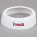 With bold maroon lettering imprinted along each collar's exterior, this TableCraft CM12 salad dressing dispenser collar set makes it easy for staff and patrons to pick the salad dressing of their choice! In this set, you'll receive (1) each of "Blue Cheese," "French," "House," "Italian," "Lo-Cal," "Ranch," "Russian," "1000 Island," "Vinaigrette," and "Honey Mustard." Each white plastic collar is designed to fit 48 oz. TableCraft salad dressing dispensers.