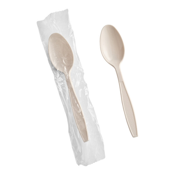 This Choice beige heavy weight wrapped polystyrene plastic teaspoon is perfect for your take-out restaurant, cookout, party, gathering, or other catering event.