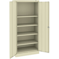 Equip your warehouse, office, or industrial space with this economical Tennsco 15" x 30" x 66" putty standard storage cabinet with solid doors 6615-CPY. This cabinet boasts a durable carbon steel construction with a putty powder-coated finish, ensuring longevity. The dual swing-out doors ride on heavy-duty hinges for a smooth performance, and reinforced panels in the doors provide further stability to prevent shaking and vibrating upon opening. For maximum security, this unit is also equipped with a three-point locking mechanism. Additionally, the base of the cabinet is raised, protecting the contents from potential harmful cleaning chemicals.