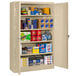 Equip your warehouse, office, or industrial space with this heavy-duty Tennsco 18" x 48" x 78" sand jumbo storage cabinet with solid doors J1878SU-SND. This cabinet boasts a durable carbon steel construction with a sand powder-coated finish for superior durability and sturdiness. The 20-gauge dual swing-out doors ride on heavy-duty hinges for a smooth performance, while reinforced panels in the doors provide further stability to prevent shaking and vibrating upon opening. For maximum security, this unit is also equipped with a three-point locking mechanism. Additionally, the base of the cabinet is raised, protecting the contents from potential harmful cleaning chemicals.