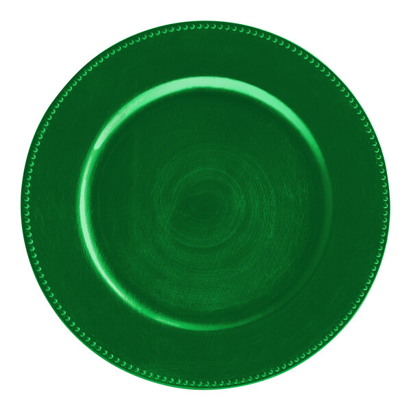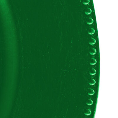 With a classic, beaded rim, slightly worn edging, and bold, emerald green color, this charger plate will further accent your table setting. Made of durable polypropylene, this charger plate is strong and can withstand daily wear and tear.