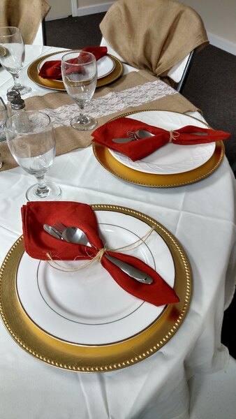 These gold charger plates are exactly what we needed to complete the tablescape for my niece's wedding in October. She wanted rustic with burlap and lace and an elegant touch and that's what she's getting!