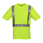 Designed for functionality, this safety shirt features short sleeves for breathability, making it suitable for use in warm weather environments. It is equipped with a pocket on the chest for essential tools and devices such as pens, flash lights, and cell phones. The fluorescent lime material provides excellent daytime visibility, while the 2" harness layout silver tape reflects light for 360-degree nighttime conspicuity. This shirt meets ANSI / ISEA 107 Type R, Class 2 standards for high visibility.