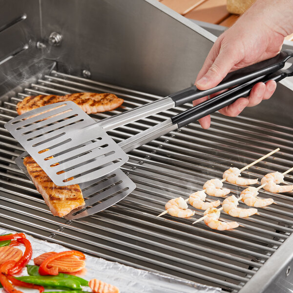 The one-piece stainless steel construction ensures durability and longevity, making these tongs a reliable tool for any grilling or cooking task. The polypropylene-coated handle provides a comfortable grip and protects your hands from the effects of high heat, allowing you to confidently maneuver your food on the grill or flat top.