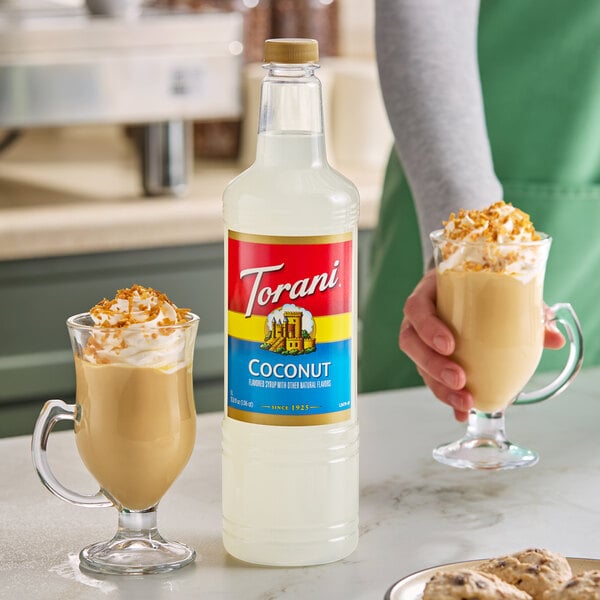 Bring all new flavors to your specialty drink menu with this Torani coconut flavoring syrup! This tempting flavor will complement your beverages without overpowering them or being too sweet, while the user-friendly bottle will be convenient for your busy baristas to use. The syrup is packaged in a convenient plastic bottle which prevents broken glass in the prep area, and it can easily be paired with a compatible pump (sold separately) for quick, efficient service during peak serving hours. This dairy-friendly Torani flavoring syrup is specially formulated to resist curdling in milk and to hold up well under heat, making it the perfect choice for espresso-based drinks, brewed coffee, or tea.