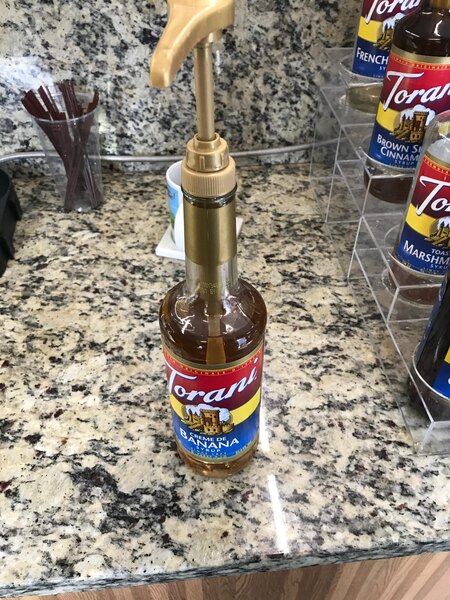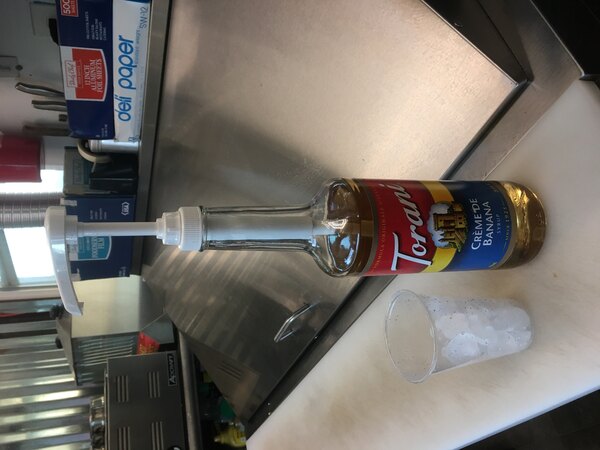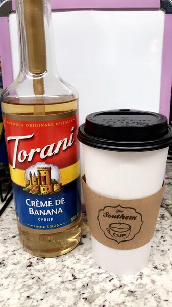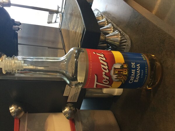 The Torani Creme de Banana Flavoring / Fruit Syrup (750 mL Glass Bottle) delivers a sweet, creamy banana flavor with a bright yellow hue, ideal for enhancing cocktails, milkshakes, smoothies, iced coffees, and baked goods like banana bread pudding.