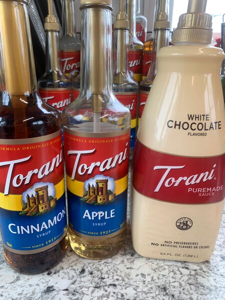 Perfect white chocolate sauce by Torani. It melts beautifully in hot drinks and it's a customer favorite.