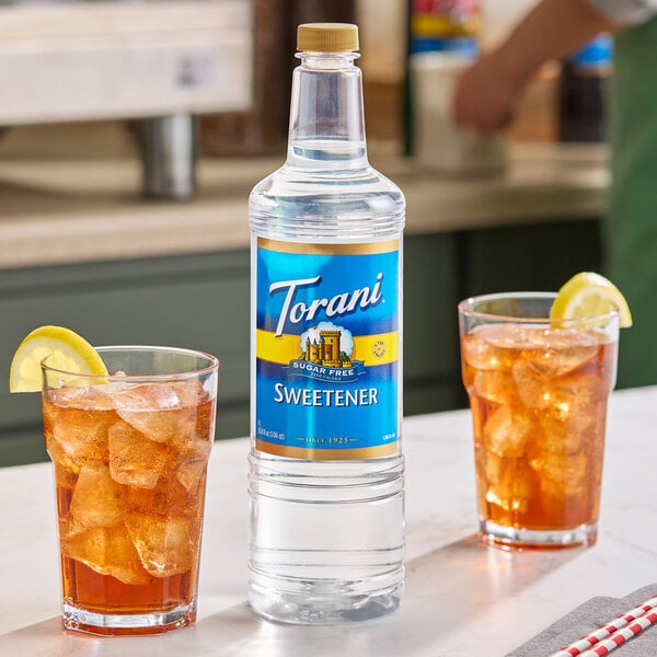 Add a splash of sweetness to your specialty drink menu with this Torani sugar-free sweetener syrup! It's sweetened with sucralose, which offers the taste of real sugar without the calories. This tempting sweetener will complement your beverages without overpowering them or being too sweet, while the user-friendly bottle will be convenient for your busy baristas to use. The syrup is packaged in a convenient plastic bottle which prevents broken glass in the prep area, and it can easily be paired with a compatible pump (sold separately) for quick, efficient service during peak serving hours. This dairy-friendly sweetener syrup is specially formulated to resist curdling in milk and to hold up well under heat, making it the perfect choice for espresso-based drinks, brewed coffee, or tea.