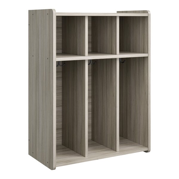 Give school age children a place to keep their belongings with the Tot Mate TML402R.S3322 shadow elm 3 section laminate toddler floor locker. This locker is constructed of durable laminate with recycled/reclaimed core materials and an attractive shadow elm finish. Each main locker compartment has double coat hooks so it can hold heavier and bulky items such as winter apparel or backpacks. Upper cubbies are ideal for holding the children's smaller belongings, such as lunch boxes, school supplies, and books. The laminate surface is easy to wipe down to keep clean and properly sanitized. This item comes unassembled.