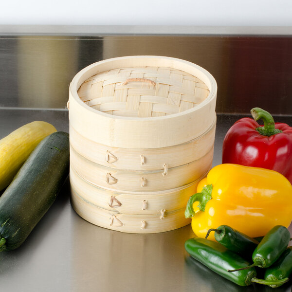 This set is crafted from 100% commercial-grade, white bamboo and contains no metal in its construction. Unlike metal steamers, bamboo is an extremely effective steaming material due to its ability to absorb condensation. Its body features neatly fitted bottom slats, which along with its tightly hand-woven lid, ensures your foods are properly steamed for optimal flavor. Plus, being made with only sustainable materials, this steamer set offers a great option for your vegan or eco-conscious business!