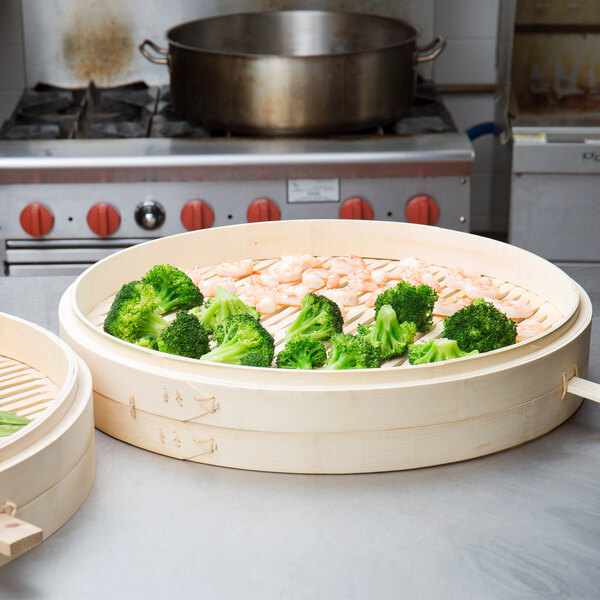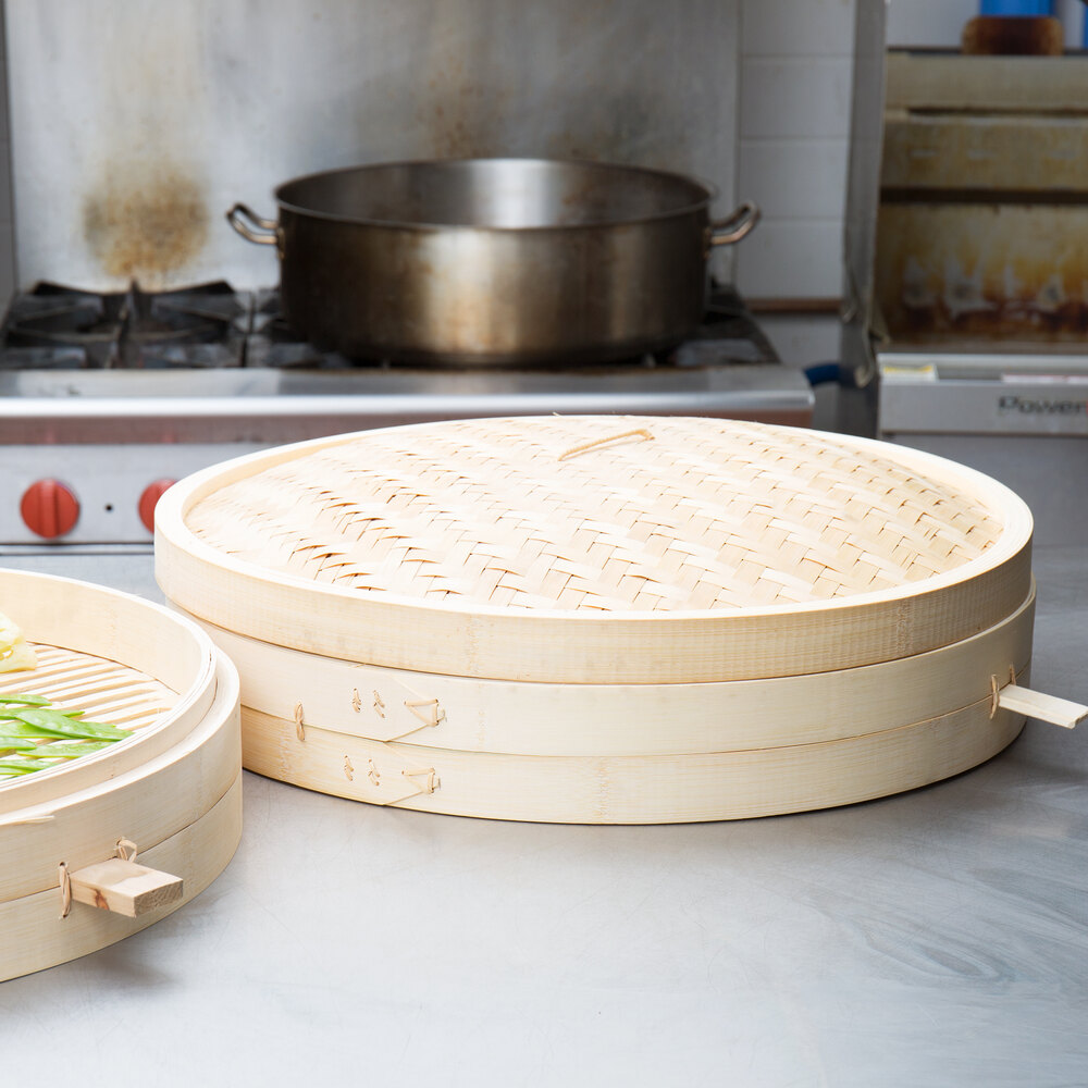 This set is crafted from 100% commercial-grade, white bamboo and contains no metal in its construction. Unlike metal steamers, bamboo is an extremely effective steaming material due to its ability to absorb condensation. Its body features neatly fitted bottom slats, which along with its tightly hand-woven lid, ensures your foods are properly steamed for optimal flavor. Plus, being made with only sustainable materials, this steamer set offers a great option for your vegan or eco-conscious business!