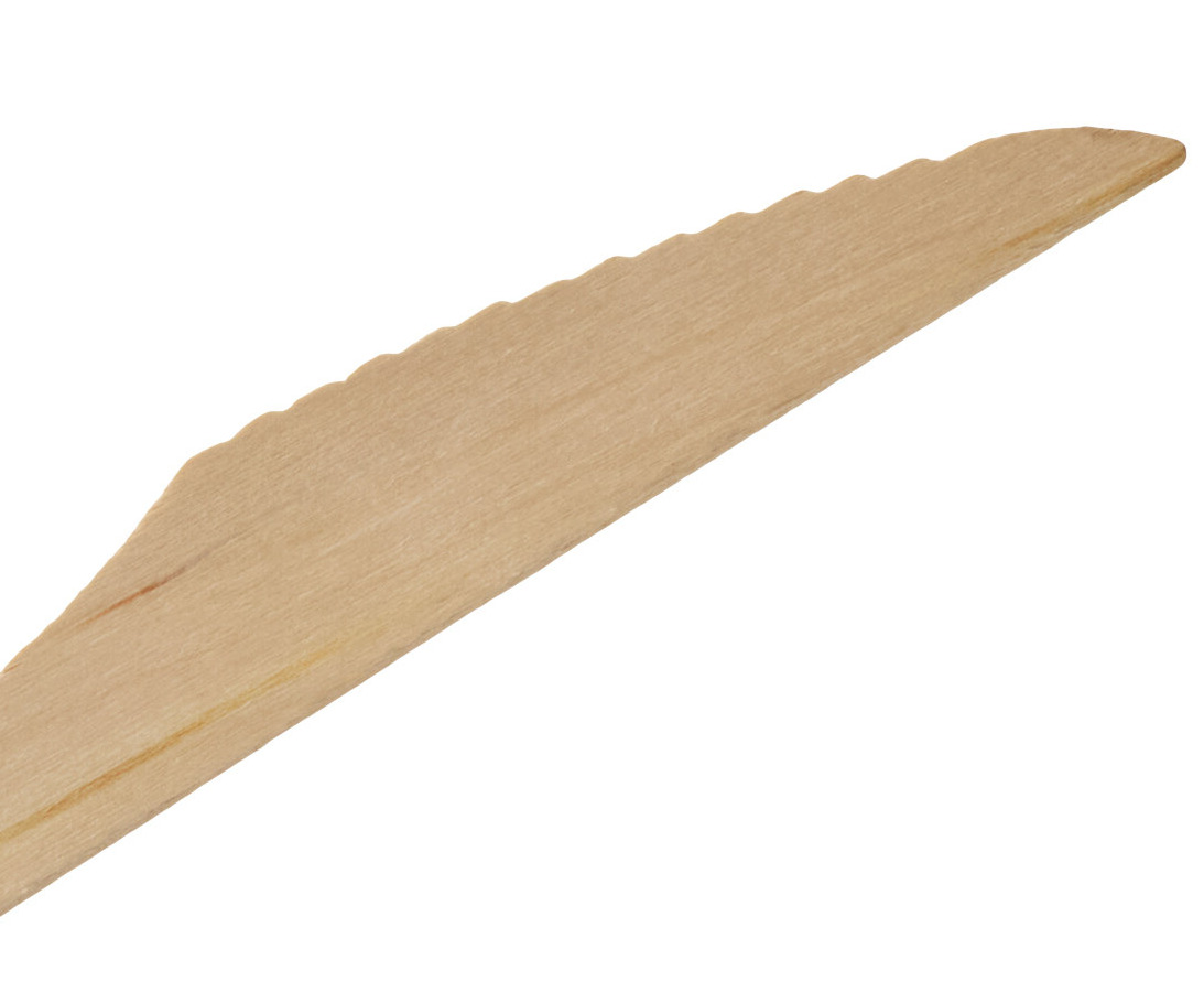 This knife is made of wood, with a subtle color that looks great in higher-end and casual environments alike. Plus, its full 6 1/4" length makes it perfect for serving your signature dishes at any deli, food truck, grocery store, or concession stand! Best of all, you won't have to sacrifice durability for this all-natural product, as its sturdy, high-quality design is able to support heavy appetizers and desserts.