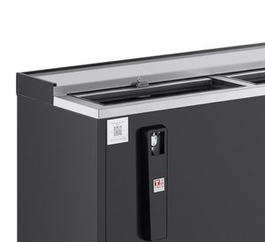 Designed to accommodate the inevitable spill or leak, this bottle cooler's interior features a galvanized steel construction. The unit boasts a black powder-coated steel exterior with a stainless steel countertop and lids. This tough construction helps minimize damage to the cabinet from routine loading and unloading, ensuring that it withstands the test of time in your bustling business. Plus, it can hold up to 37 1/2 cases of 12 oz. bottles or 55 cases of 12 oz. cans, providing you with plenty of storage space, and the stainless steel lids have handles that are easy to keep clean and slide open in order to serve guests quickly.