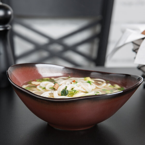 This bowl may be used in combination with other size and color choices in the TuxTrendz Artisan line to create the perfect place setting at your restaurant, cafe, pub, or lounge. Durable and resistant to wear, this dish offers a creative backdrop to whatever foods you wish to serve. The rich, russet palette paired with the natural edge gives a hand-thrown appearance to enhance the rustic look. Whether needed at a diner, restaurant, or high-end bar, the Red Rock line is the perfect, eye-catching choice.